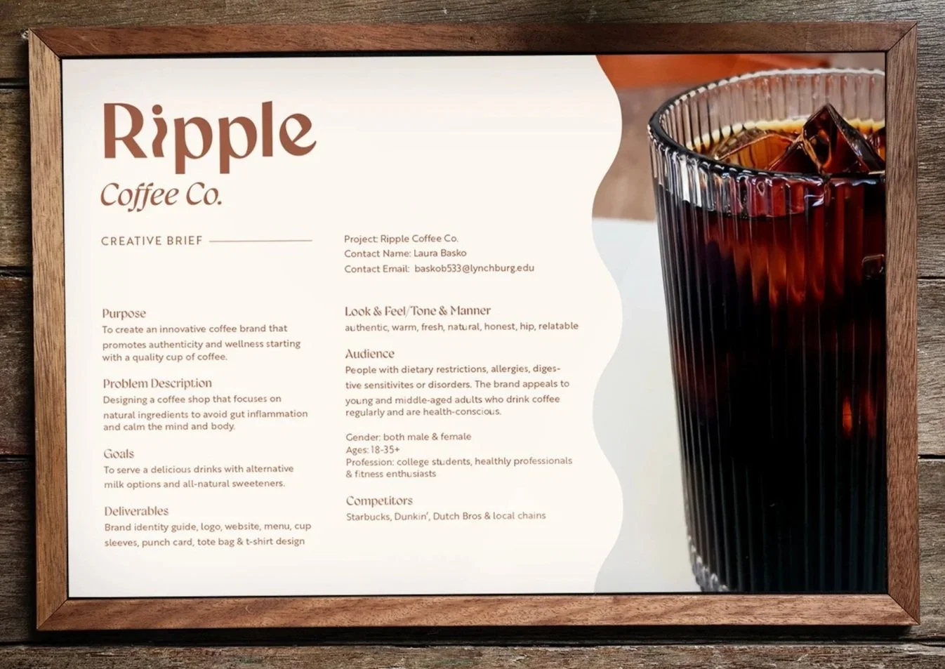 Ripple Coffee Co. is a conceptual coffee brand that prioritizes clean ingredients to promote gut health and balance within the body. The mindful ingredients and warm atmosphere set begin a ripple effect in the body and mind — redefining the coffee experience as a ritual of restoration rather than rush.
