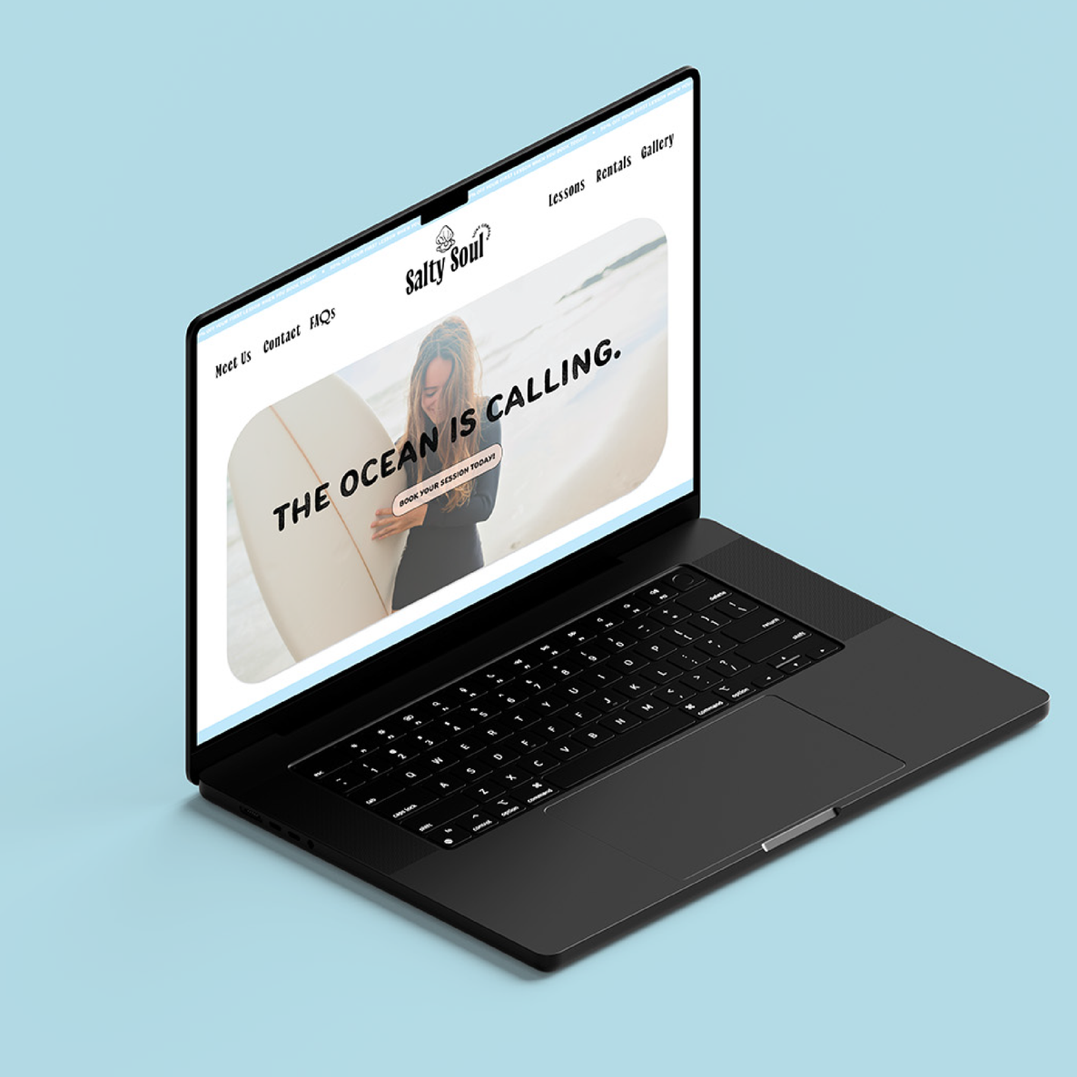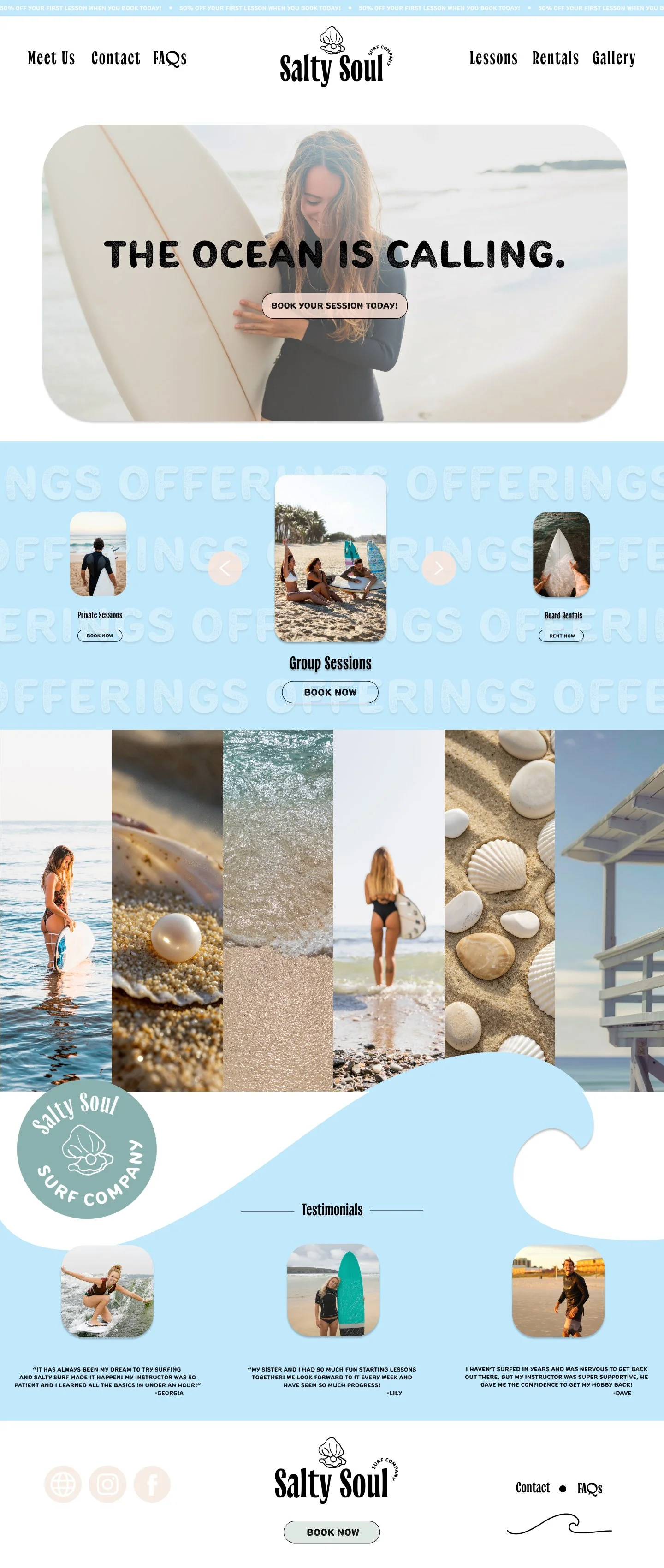 This homepage design for Salty Soul Surf Co. captures the company’s relaxed, coastal vibe with warm photography, playful typography, and soft pastel colors. The layout highlights key offerings such as lessons and rentals, encouraging users to book sessions with clear, engaging calls-to-action. Soft blues, sandy neutrals, and rounded imagery evoke a sense of calm and adventure, while the wave-shaped graphic elements and casual headline fonts add personality and flow. Designed in Figma, the site balances simplicity and visual impact for a seamless user experience.